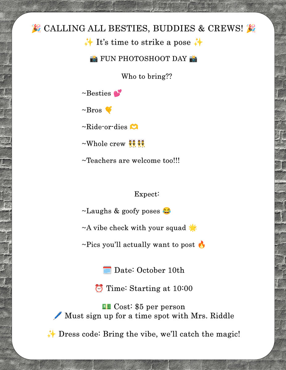 There will be Friends Photoshoot Day for Middle School students on Friday, October 10, starting at 10:00. The cost is $5 per person and students must sign up with Mrs. Riddle for a spot.